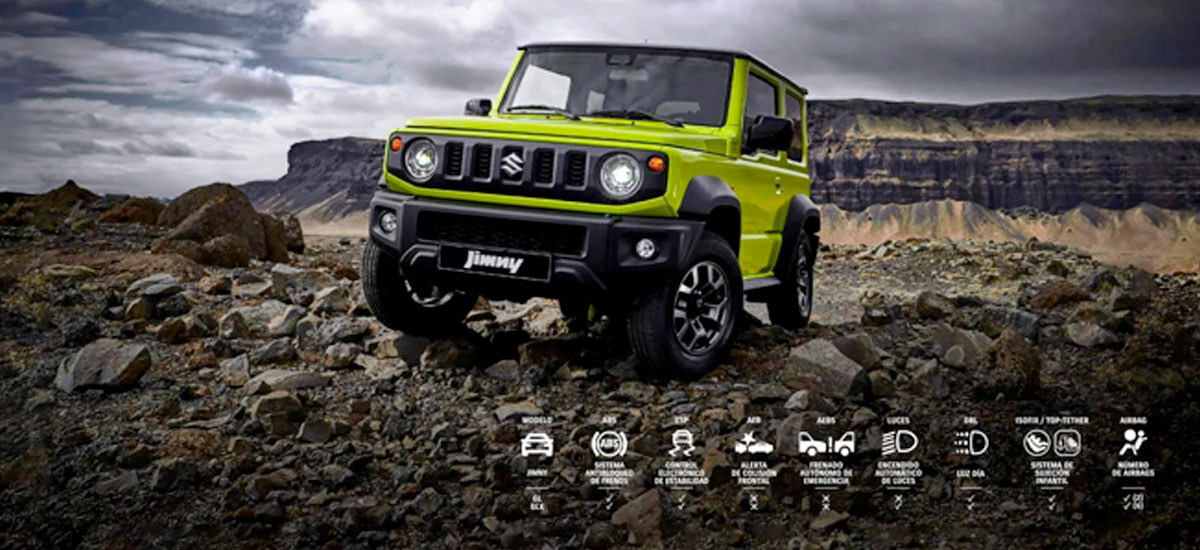 El Suzuki Jimny fue construido con las cuatro claves que definen un verdadero vehículo off-road: Sistema 4×4, bajo chasis independiente tipo escalera, amplios ángulos de operación y altura al piso, suspensión de eje rígido ALL-GRIP® PRO® (4×4 real). Este sistema brinda el control total al conductor para controlar el desempeño del Suzuki Jimny en cada tipo de terreno. Puede modular fácilmente entre tracción 4×2, 4×4 y 4×4 más caja reductora